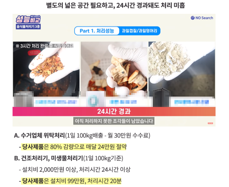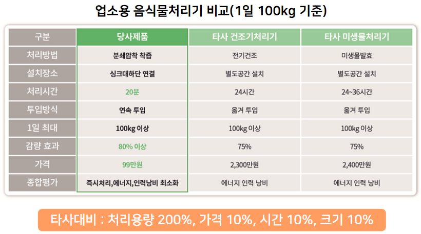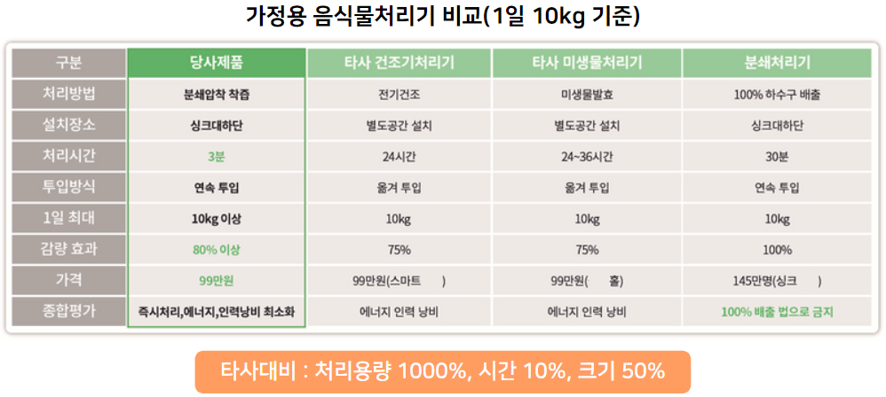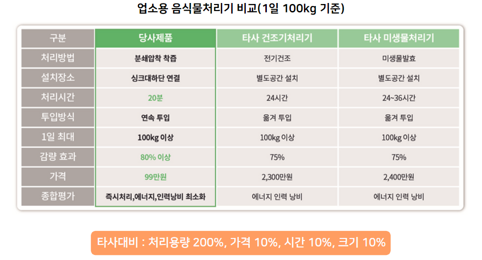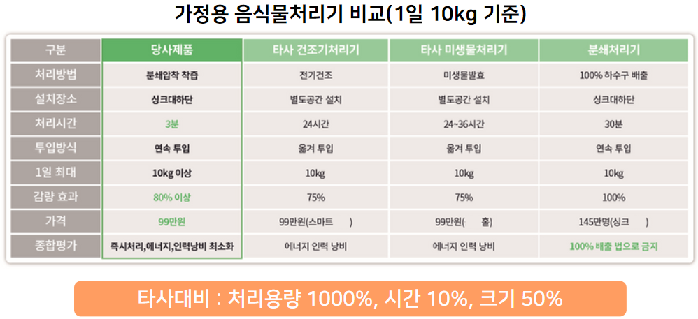 음식물처리기 보조금 지급은 이미 시작되었고, 전국적으로 번지는 것은 이제 시간문제입니다. 당사제품은 타사대비 감량율도 훨씬 높고, 감량시 에너지도 90%가 절약 되기 때문에 보조금 50% 지원을 못 받을 이유가 없습니다.