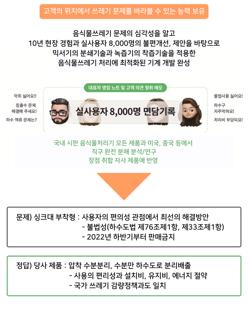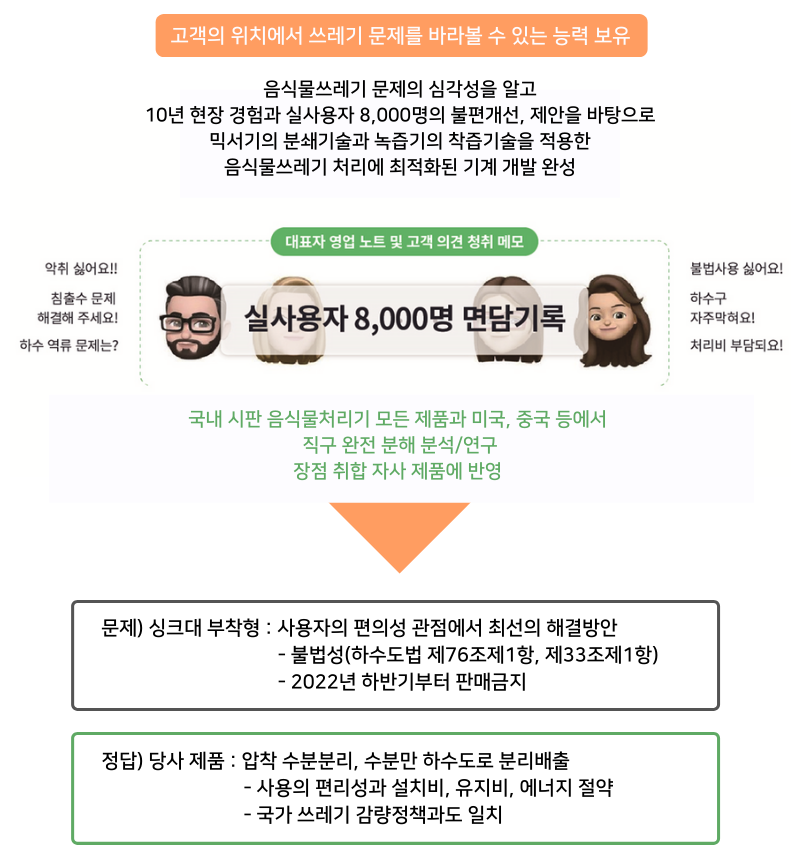 음식물쓰레기 문제의 심각성을 누구보다 잘 알고 있던 ‘따뜻한 꿈’의 김용구 대표는 10년 간의 설치, A/S, 고객관리의 현장 경험을 바탕으로 실사용자 8,000명으로 부터 직접 면담을 통해 얻은 불편 개선&제안 내용을 반영하여 믹서기의 ‘분쇄기술’과 녹즙기의 ‘착즙기술’을 융합한 음식물쓰레기 처리에 최적화된 제품, 'ThinkSink'를 개발하게 되었습니다.