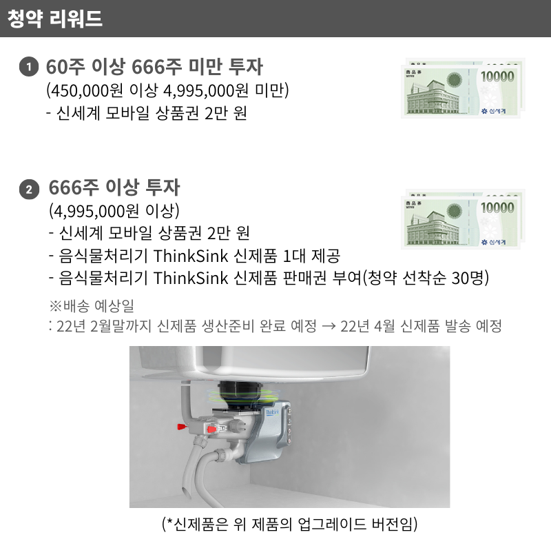 'ThinkSink'는 압착 수분 분리 방식으로 수분만 하수도로 배출되어 하수구 막힘이 없고, 타사대비 처리시간은 1/10, 설치비와 유지비도 대폭 줄어드는 획기적인 제품으로써 음식물쓰레기 시장에 큰 혁신을 가져올 것으로 기대됩니다.