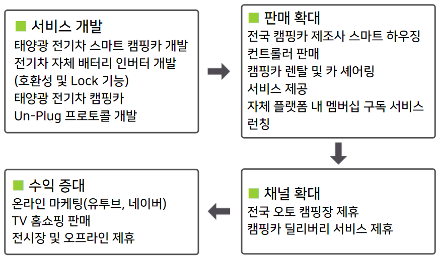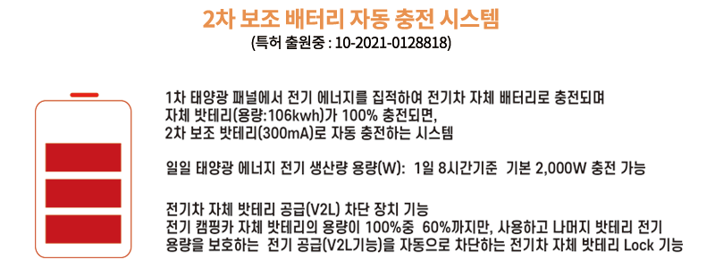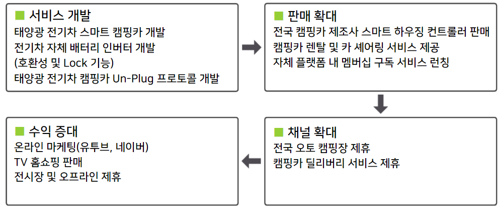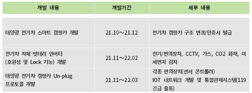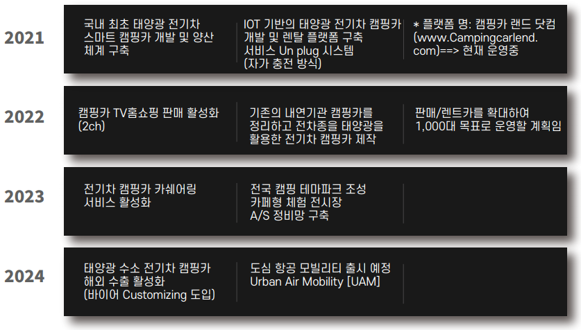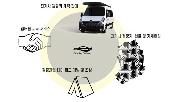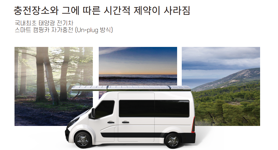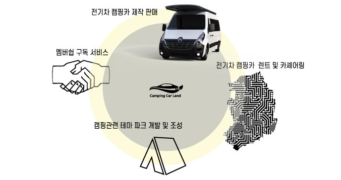 특히 캠핑카랜드는 국내 최초로 태양광 전기차 스마트 캠핑카를 개발하고 양산할 계획입니다. IOT 기반의 자가충전방식의 전기차 캠핑카를 개발하여 누구나 쉽게 렌탈 방식으로 이용할 수 있도록 태양광 전기차 렌탈 플랫폼 서비스도 구축할 예정입니다.