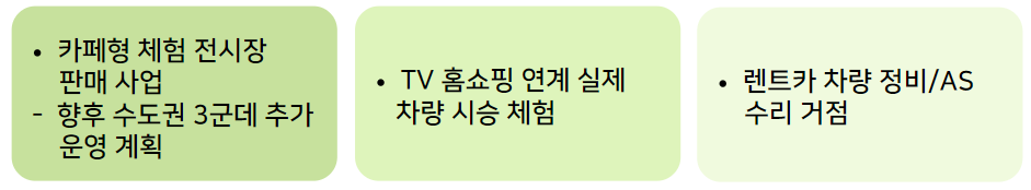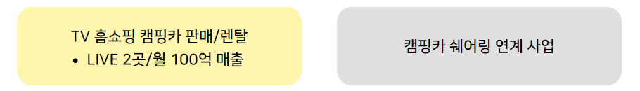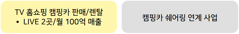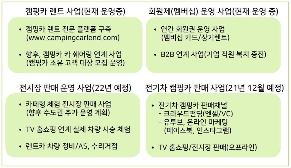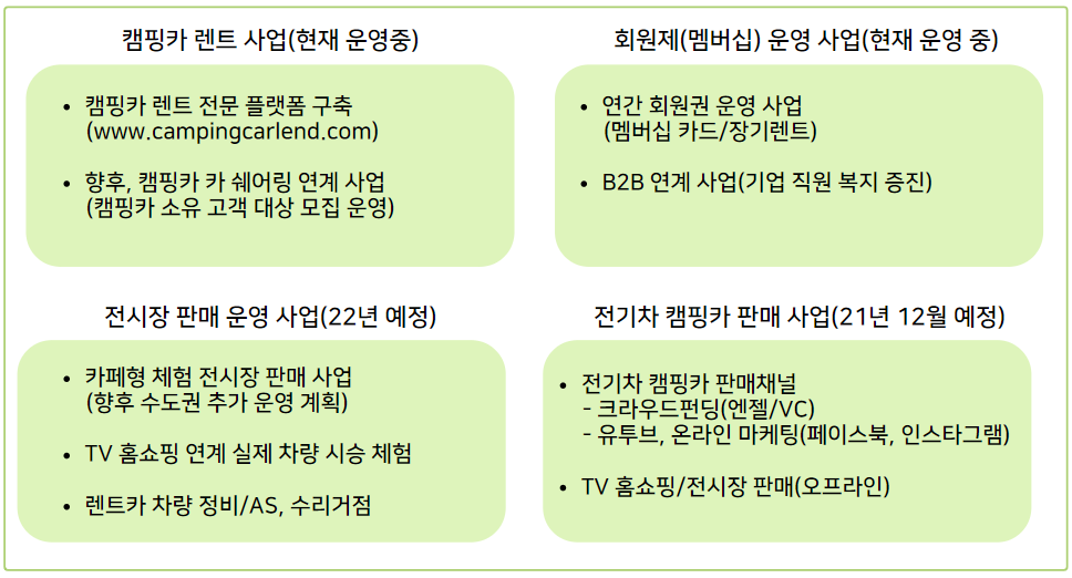 또한 국내 최초로 「OUT DOOR IOT APP」을 개발하여 언제 어디서나 쉽고 빠르게 모빌리티를 기반으로 캠핑카 렌트 예약 및 결제를 할 수 있도록 서비스를 제공하고 전국 오토 캠핑장·팬션·유명 낚시터와 제휴하여 할인 이용권을 제공하고 있으며, 캠핑 Life 자사 쇼핑몰을 통한 캠핑카 및 캠핑용품 판매와 해외 수출도 주력으로 하고 있습니다.