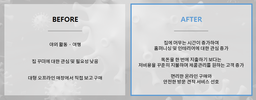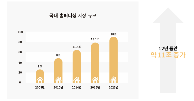 전 세계적으로 홈퍼니싱 시장은 매년 15% 이상 성장하고 있으며, 국내의 홈퍼니싱 시장도 2008년 7조원 규모에서 2020년 13조7천억원으로 두 배 이상 확대되었습니다(통계청 조사).