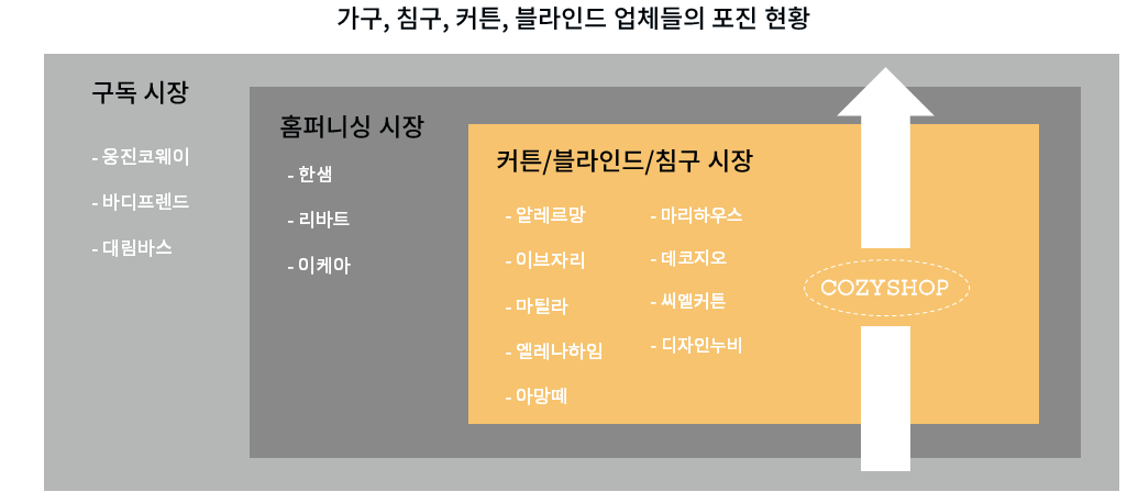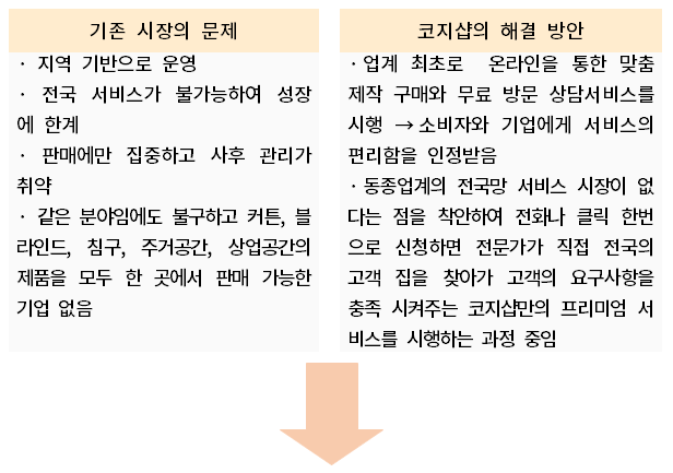 지금까지 동종 업계는 지역 기반으로 운영되는 한계 때문에 판매에만 집중해서 사후 관리가 취약하다는 단점이 있었습니다. 또한 전국 서비스가 불가능하여 성장에 한계가 있고 같은 분야임에도 불구하고 커튼, 블라인드, 침구, 주거공간, 상업공간의 제품을 모두 한 곳에서 제조·판매하는 기업이 없는 실정입니다. 코지샵은 창업부터 이러한 문제점을 해결하고자 노력하여 업계 최초로 온라인을 통한 맞춤 제작 구매와 무료 방문 상담 서비스를 시행하여 소비자와 기업에게 그 서비스의 편리함을 인정 받고 있습니다. 또한 동종업계의 전국망 서비스 시장이 없다는 점에 착안하여 전화나 온라인 클릭 한번으로 신청하면 전문가가 직접 전국의 고객 집을 찾아가 고객의 요구사항을 충족시켜 주는 코지샵만의 서비스를 만들어가고 있습니다.
