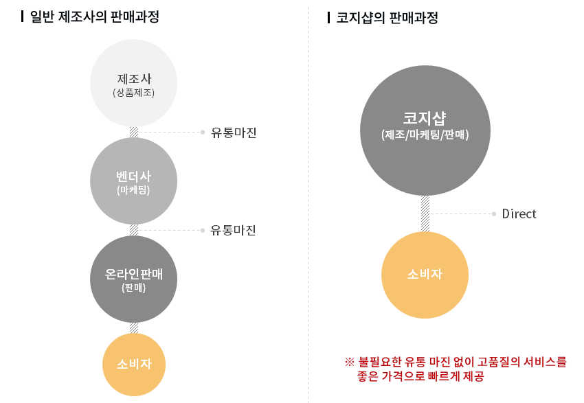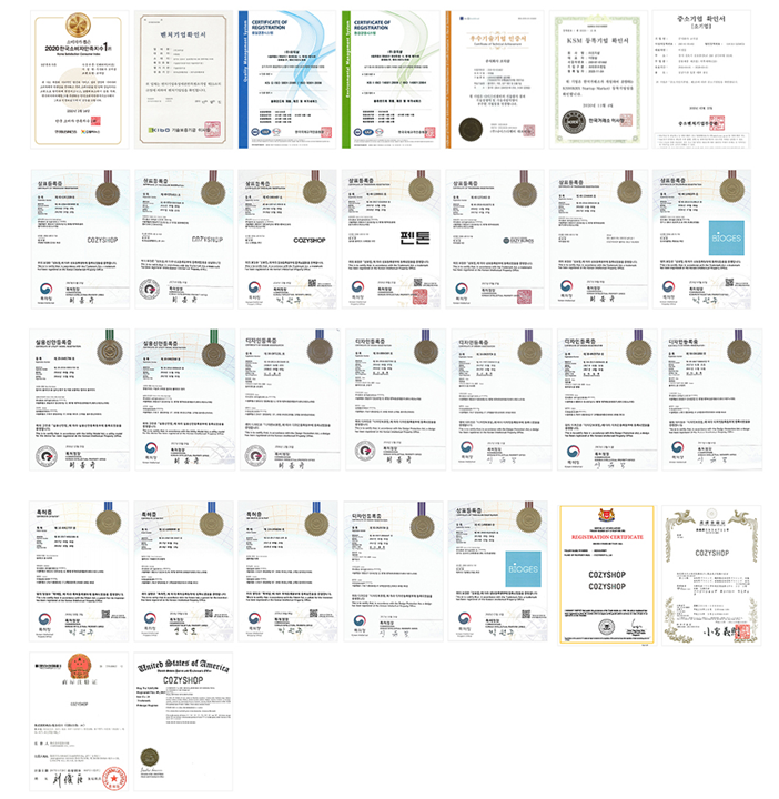 코지샵은 유통이나 제조 등 한 분야에만 한정되어 있는 경쟁사들과 달리 다양한 분야로 확장하여 시장과 시대의 변화, 재난 상황에 따라 적절히 대응하며 위기를 기회로 만들어 변화하고 성장하고 있습니다. 차별화된 운영 시스템은 비대면과 대면에 모두 완벽하게 세팅되어 있으며, 철저한 맞춤 제작과 사후 관리 시스템으로 글로벌 회사에서부터 일반 소비자에 이르기까지 모두 인정받고 있습니다. 시대의 흐름에 맞게 코지샵만의 감성적인 디자인의 상품들이 매달 기획되어 출시되고 있으며, 탁월한 소비자 맞춤 경영방식을 통해 그동안 경쟁사에서 해결하지 못했던 문제들을 완벽히 해결하고 있습니다. 또한 기업부설연구소를 운영하여 개발한 다수의 특허권을 보유하고 있어 산업재산권을 보고하고 독보적인 판매를 하고 있습니다.
