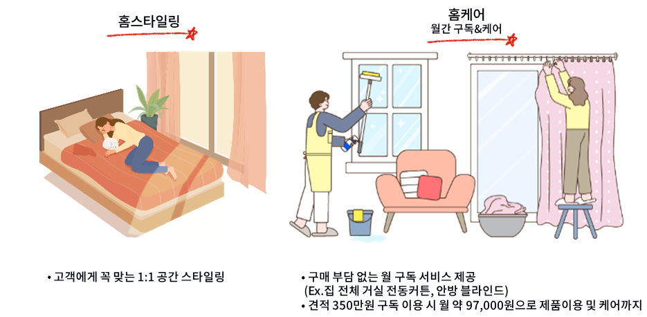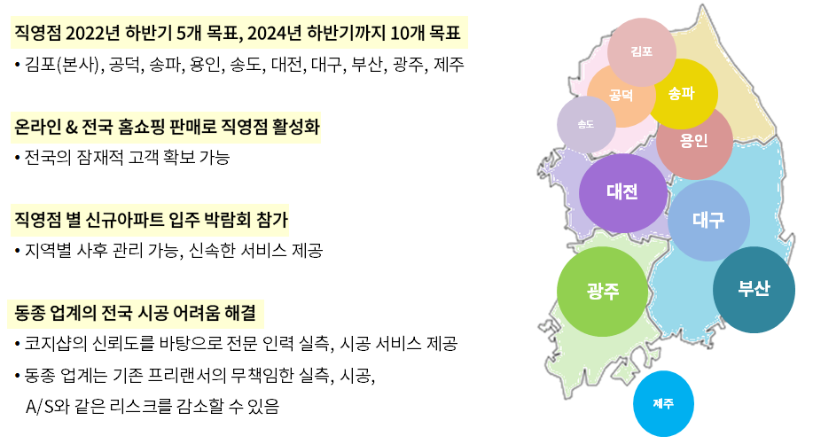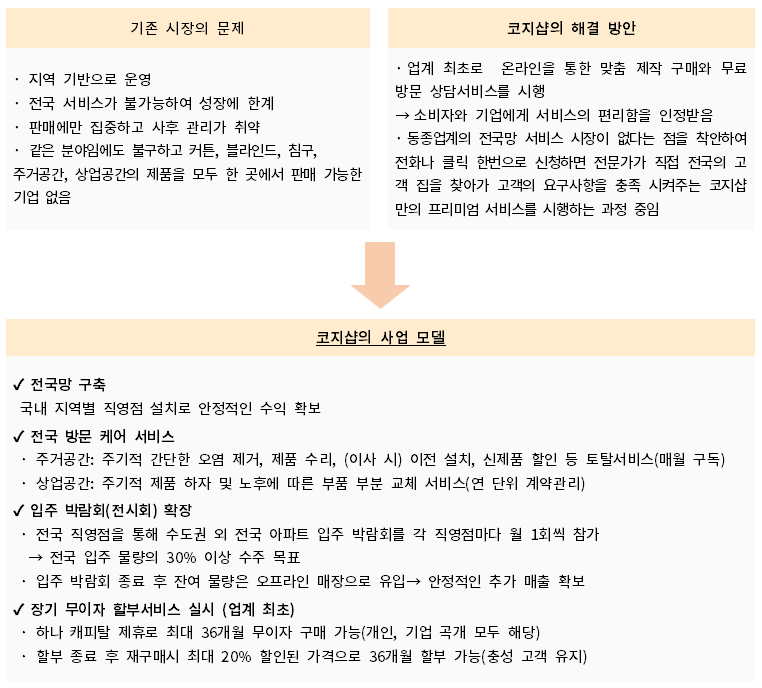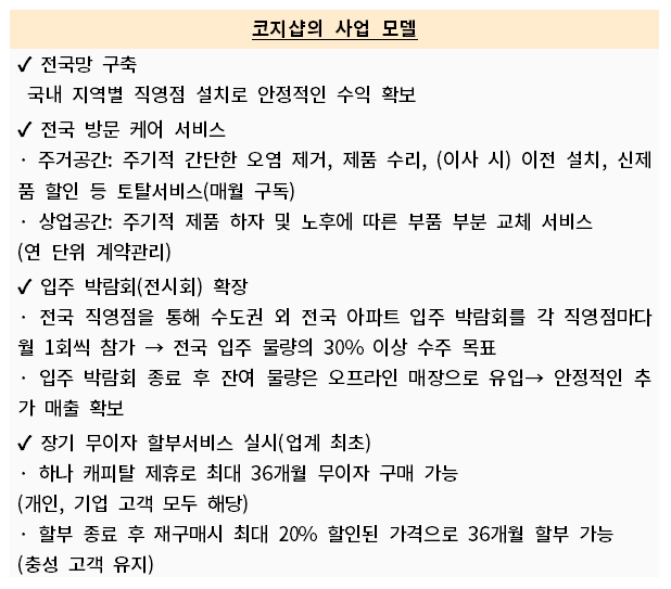 코지샵의 주요 사업모델은 1. 전국망을 구축 - 국내 지역별 직영점 설치로 안정적인 수익 확보, 온라인과 홈쇼핑을 통한 판매 및 홈스타일링 서비스 제공 / 2. 전국 방문 케어 서비스 실시 - 주거공간에 매월 구독서비스 방식을 적용하여 정기적인 오염 제거, 제품 수리, (이사할 경우) 이전 설치, 신제품 할인 등 토탈서비스를 제공하고, 상업공간에 대해서는 연 단위 계약 관리 방식으로 주기적 제품 하자 및 노후에 따른 부품 부분 교체&관리 서비스를 제공 / 3. 입주 박람회(전시회) 참여 확장 - 전국 직영점을 활용하여 수도권 외 전국 아파트 입주박람회를 각 직영점마다 월 1회씩 참가하여 전국 입주 물량의 30% 이상 수주를 목표로 하며, 입주박람회 종료 후 물량은 오프라인 매장으로 자연스럽게 유입되어 안정적인 추가 매출을 확보 / 4. 업계 최초로 장기 무이자 할부서비스(최대 36개월) 실시- 하나캐피탈과 제휴하여 최대 36개월 무이자 구매 가능, 할부 종료 후 재구매 시 최대 20% 할인, 36개월 할부 혜택 제공하고 있으며, 이 서비스는 충성 고객 유치에 큰 효과를 나타내고 있습니다.