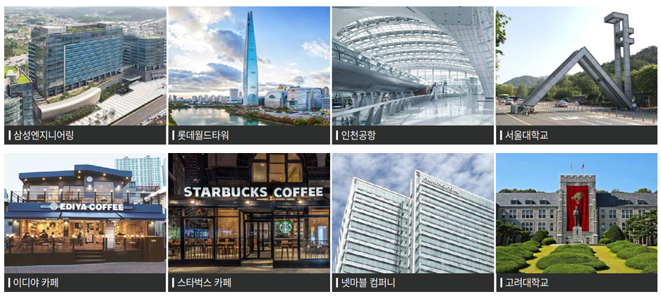 | 기 업 | 삼성엔지니어링, 삼성전기, CGV,롯데월드타워, 롯데주류, 현대백화점, 넷마블 컴퍼니, 현대아산정책연구원, 제주항공, 진에어, SM엔터테인먼트 등 |
