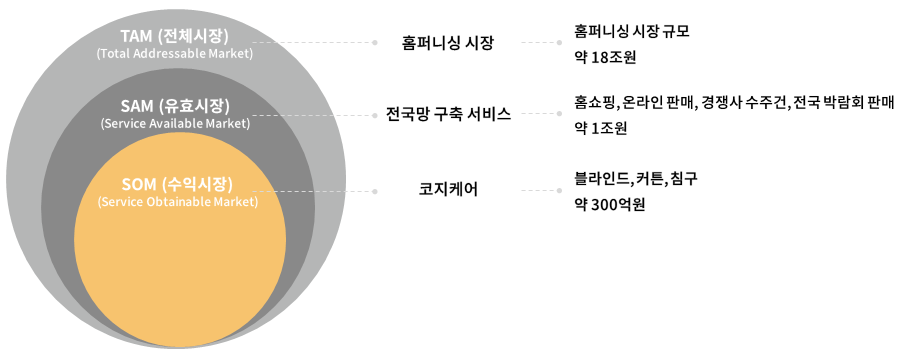 한 조사기관의 설문조사에 따르면, 2015년 대비 2020년 ‘집에서 보내는 시간이 늘어났다’고 응답한 비중은 26.1% 증가하였으며 집에서 시간을 보내는 동안 ‘집안에 나만의 공간을 만들고 싶다’라고 응답한 사람이 무려 85.6%에 달했습니다. 집에 대한 인식 및 역할 변화가 가속화되고 있음을 알 수 있는데 이는 바로 수요 증대 효과로 이어질 것입니다. 2023년 국내 홈퍼니싱 시장 규모가 18조원에 달할 것으로 예측되고 있는 가운데 커튼, 블라인드, 침구 시장은 약 3조원 규모가 될 것으로 보입니다. 코지샵이 단 1%만 점유해도 연 300억 원 매출 달성이 가능하게 됩니다.