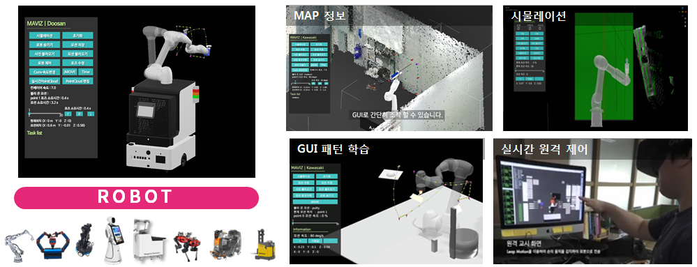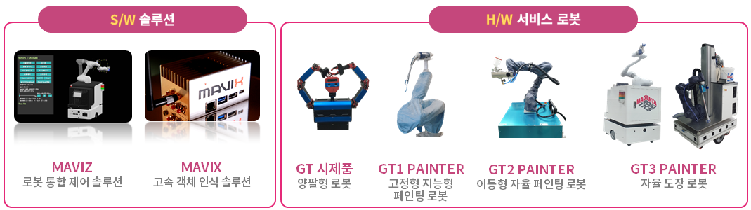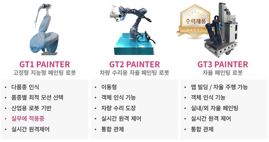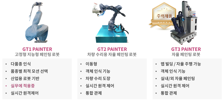 1. 원격 도장 로봇서비스는 3D(Danger, Difficult, Dirty) 작업 숙련자 부족 문제, 중대재해법 강화 문제 특히 페인팅 작업에서의 안전 문제에 주목하고 이를 해결하기 위한 방안을 찾는 것에서부터 시작되었습니다. GT PAINTER(GT1, GT2, GT3)가 제공하는 로봇 도장서비스는 다년간 자체 개발한 ‘로봇 통합 제어관리 솔루션- MAVIZ’와 병렬처리 기술이 집약된 ‘고속객체인식 솔루션 - MAVIX’ 2가지 핵심 소프트웨어가 결합되어 인공지능 제품 형상 인식, 실시간 3D 스캔, 고속 개체 인식, 3차원 로봇 모션 관리, 원격 제어가 가능합니다.