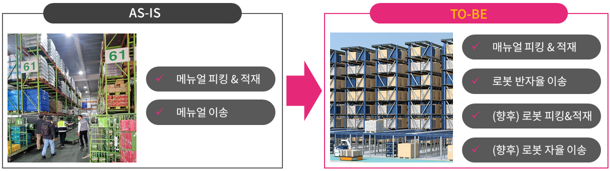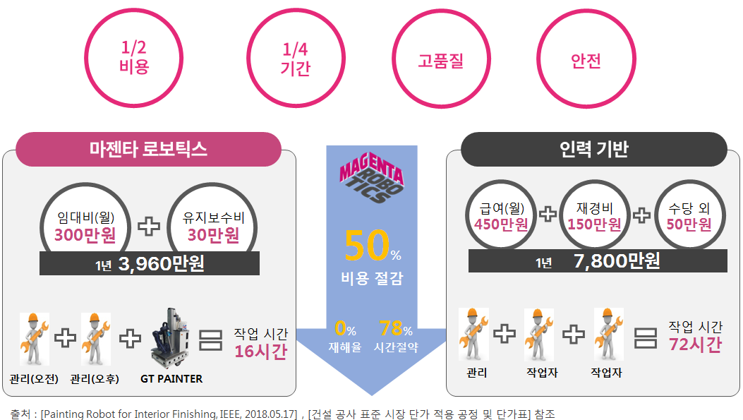 4차 산업혁명은 사람과 로봇이 각자 잘할 수 있는 영역을 재편하는 과정이라고 할 수 있습니다. 마젠타로보틱스는 ‘사람을 위한 로봇’을 개발하여 서비스를 제공하고 있습니다. 로봇이 더 잘할 수 있는 다양한 산업군에 숙련된 로봇을 투입하여 사람과 로봇 강점에 따른 R&R(Role and Role) 융합으로 최대 효율성을 추구합니다.