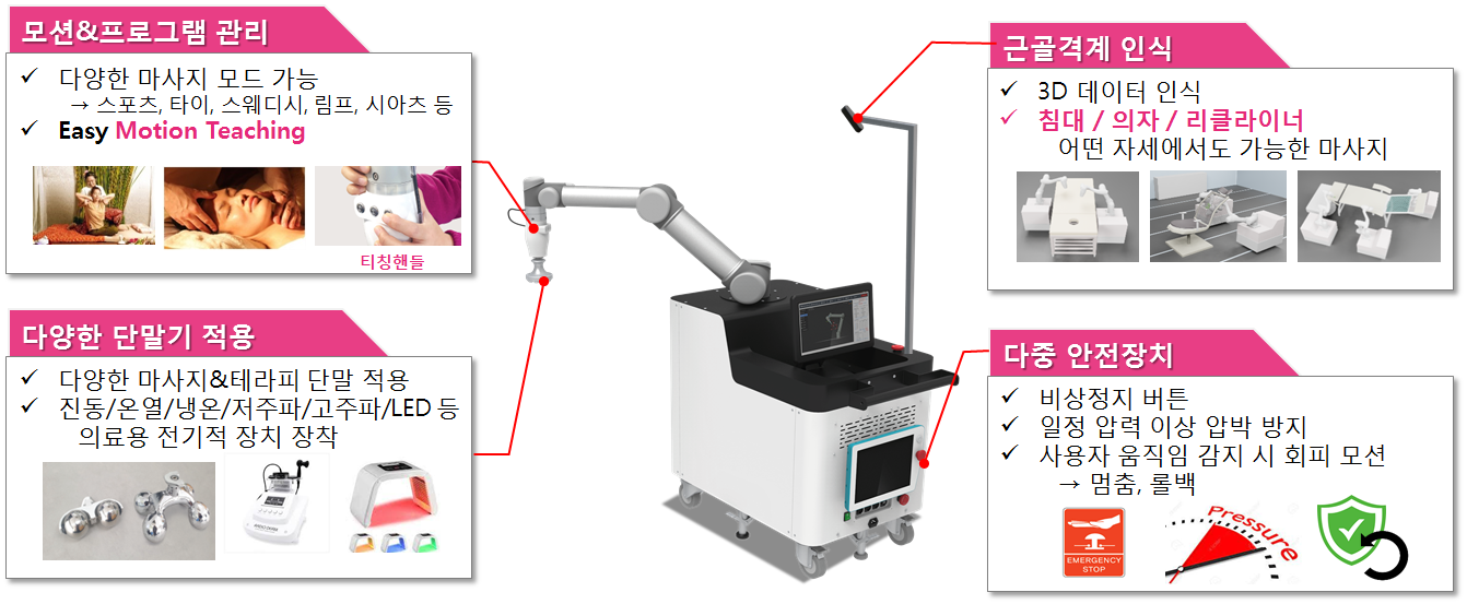 2015년 설립된 (주)마젠타로보틱스는 지능형 로봇을 개발하여 다양한 산업군에 적용하는 로봇서비스 기업입니다. 주요 아이템인 원격 도장 로봇 및 도장 서비스, 헬스&뷰티케어 로봇 서비스, 물류 로봇 서비스는 ‘HW 서비스 로봇’과 ‘특허 SW 솔루션’이 결합된 지능형 로봇 서비스입니다. ‘지능형 로봇’은 외부환경을 스스로 탐지하고 필요한 작업을 자율적·능동적으로 실행하며 모든 행동이 인간에 초첨이 맞춰져 있어 장소, 상황에 맞는 최고의 서비스를 제공합니다. 이는 전자, 정보, 기계, 센서, 소프트웨어, 반도체, 인공지능 등이 총망라되는 첨단기술의 복합체로서 앞으로 신산업 창출을 촉진하고 관련 기술 혁신을 주도해갈 분야라고 할 수 있습니다. 크게 제조업용 로봇, 전문서비스용 로봇, 개인서비스용 로봇으로 분류되는 ‘지능형 로봇’은 출산율 감소, 고령화 사회 진입으로 인한 인력 대체 뿐만 아니라 감염병이나 위험지역 출입 등 위험 업무에 노동력 대체 가능한 미래 산업 분야로 평가받고 있습니다.
