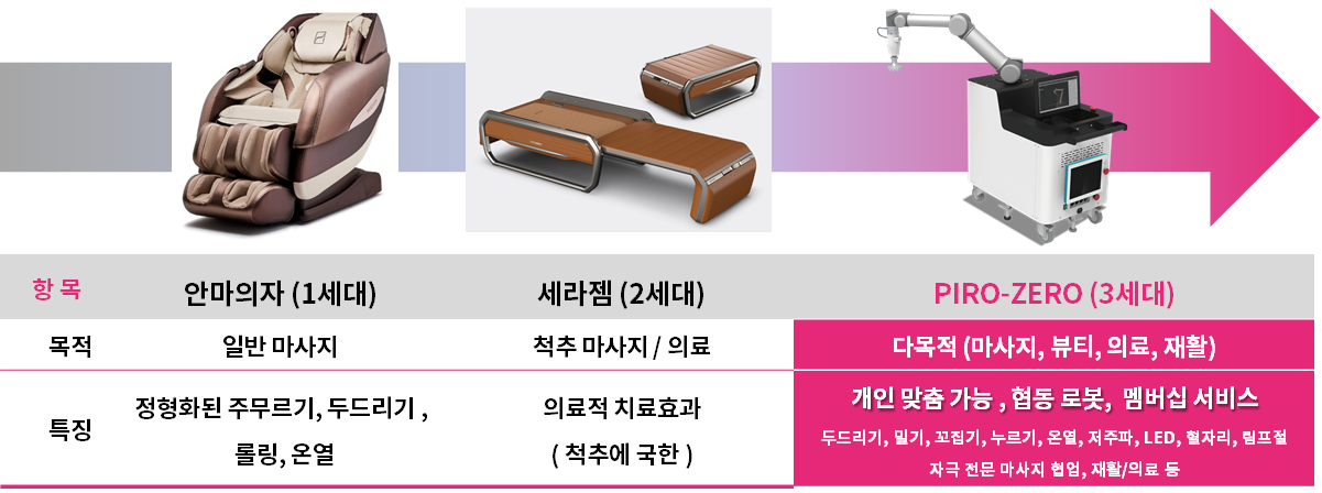 2. 지능형 헬스&뷰티 케어 로봇 서비스를 제공하는 PIRO-ZERO-알파는 마사지, 뷰티, 의료, 재활 등 다목적 기능의 제품으로 특허받은 근골격 인식 기술이 적용된 마사지 로봇입니다. 현재 2,700억 규모의 국내 마사지 시장에는 안마의자 위주의 제품들로 판매되고 있으며, 지능형 로봇을 이용한 제품은 없는 상태이며, PIRO-ZERO-알파가 마사지 기기의 세대 교체를 이루어낼 것입니다.