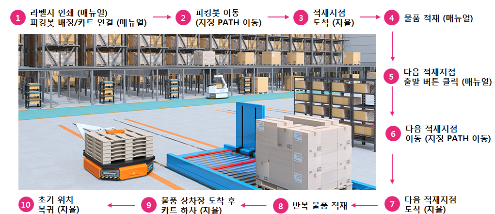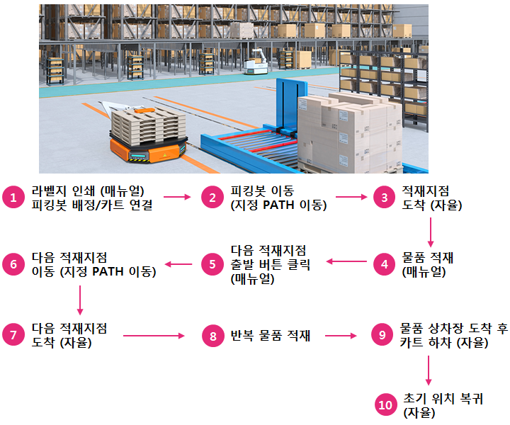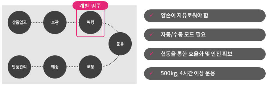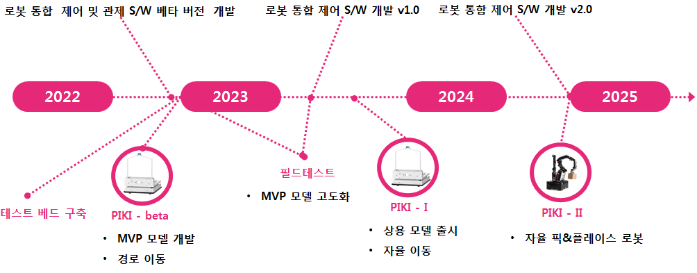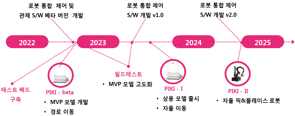 3. 지능형 물류 로봇서비스를 제공하는 PIKI는 매년 35%씩 성장하고 있는 무인운송 로봇시장을 타깃으로 피킹 작업의 인력난 해소, 안전 개선 및 효율화를 위해 개발한 제품입니다. 메뉴얼 피킹&적재, 메뉴얼 이송이 가능한 현 물류 시스템을 로봇 반자율 이송, 더 나아가 로봇 피킹&적재 뿐만 아니라 로봇 자율 이송까지도 가능하게 함으로써 물류 피킹 상용화 로봇 기반을 확보해 나갈 것입니다.