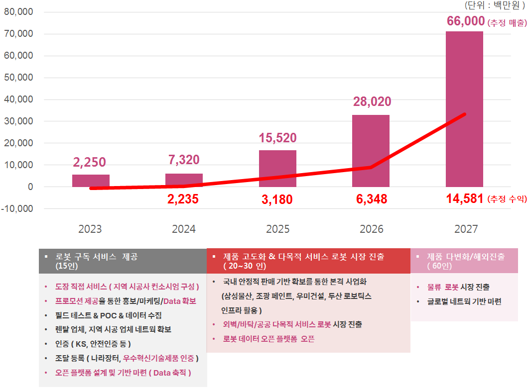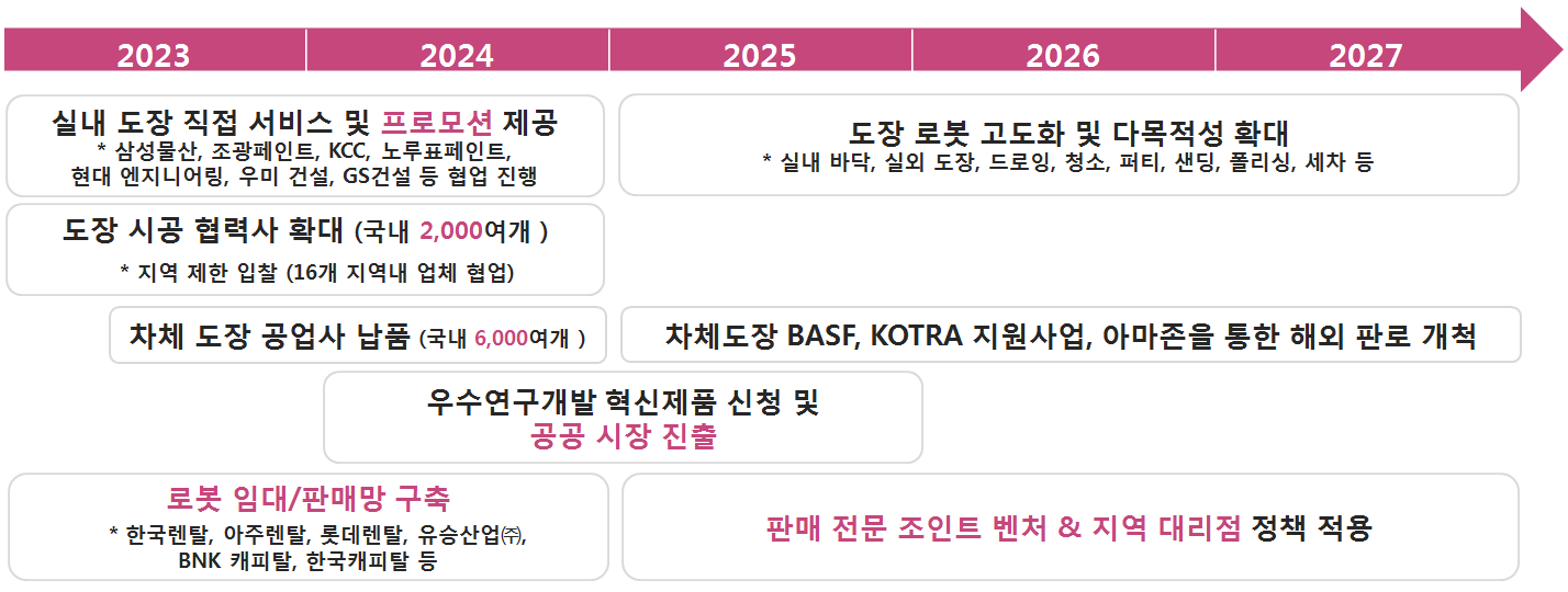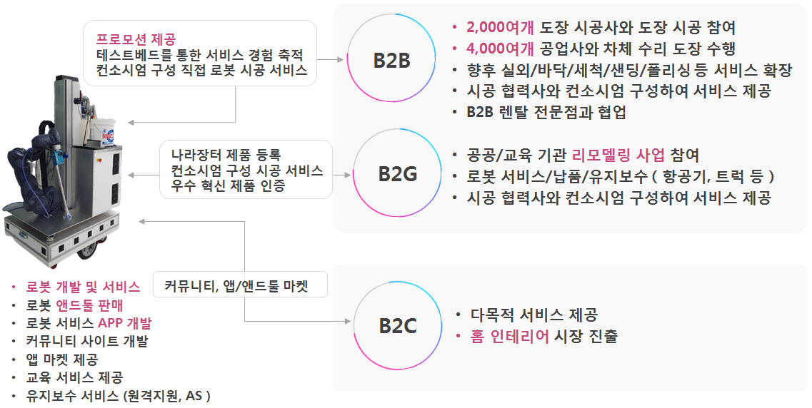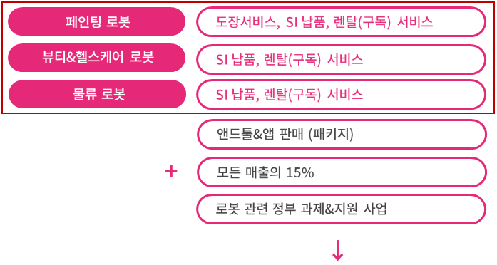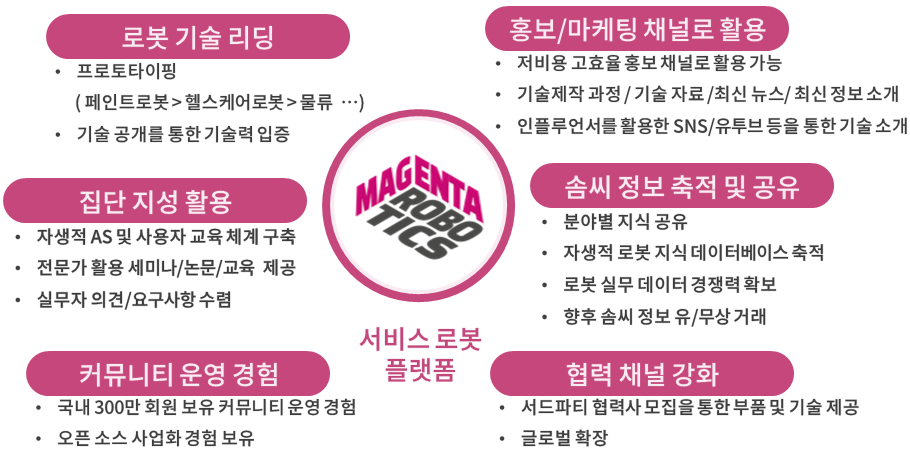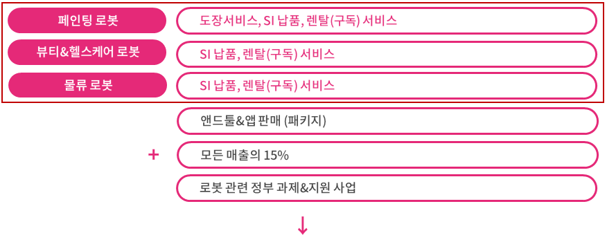 마젠타로보틱스의 수익모델은 크게 제품판매, SI 납품(구축), 도장서비스(페인팅로봇), 로봇 파견(렌탈) 사업, 로봇 교육, 로봇 유지 보수, 데이터 판매 등 다양합니다.