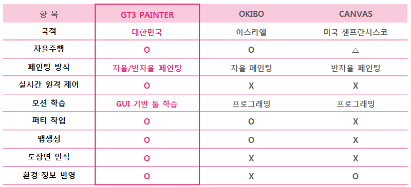 원격 도장 로봇서비스는 인력 기반의 작업 시보다 비용 1/2 절감,  365/24 작업 가능, 1/4 작업시간 단축 뿐만 아니라 일관성 있고 정밀한 고품질 서비스 가능, 숙련자 솜씨 데이터 저장 및 숙련자 패턴 정보 표준화 진행으로 작업 진행시마다 노하우에 대한 DATA화가 가능합니다.  현재 GT PAINTER의 타겟 시장은 실내 및 차량 도장 시장이지만, 점차적으로 건물 외벽(세척+실링)과 차량/항공/선박(특수세척+코팅), 홈페인팅 시장으로 확장해 나갈 계획입니다.