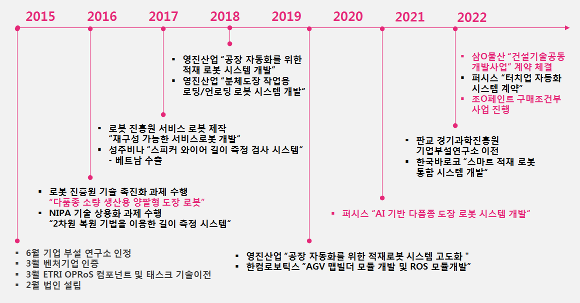 마젠타로보틱스의 검증된 기술력은 그동안 40여 개의 로봇 관련 정부과제 및 지원사업을 수행해오면서 축적한 경험 및 기술이 원천입니다. 이는 시제품 개발 후 필드 적용 및 상용화하는 데에 있어서 큰 힘이 되고 있습니다.
