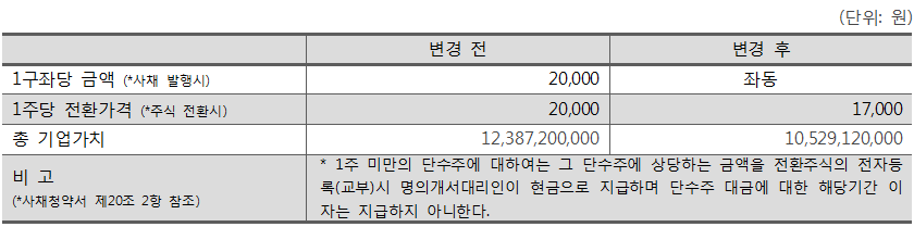 이번 크라우드펀딩을 통한 최종 전환가격은 1주당 17,000원으로 결정하였습니다. 당사에서 1주당 20,000원(기업가치 총 12,387,200,000원)으로 진행하고자 하였으나, 최근 금리인상과 조정된 주식시장 상황을 고려하여 1주당 17,000원(기업가치 총 10,529,120,000원)으로 변경하였습니다. 관련 내용은 아래 수정내역을 참고 부탁드립니다.