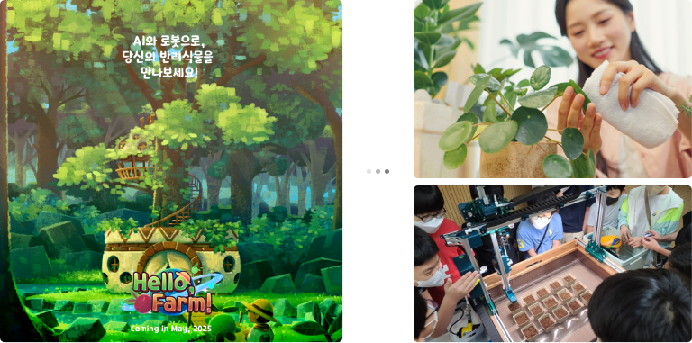 이후 온라인과 오프라인이 어떤 지점에서 만나면 강력한 시너지를 일으킬 수 있을까?에 대한 답을 찾는 과정에서 농·생명을 소재로 한 메타버스 서비스 아이디어를 얻고 가상세계에서 농지를 관리하면 실제 식물을 재배하는 온·오프라인 융합형 메타버스 게임 ‘헬로, 팜’을 개발하게 되었습니다. ‘헬로, 팜’은 2021년 SW융합클러스터 사업에 참여하면서 시제품 개발에 착수했으며, 2023년~2024년까지 실증 사업을 거쳐 올해 기술 고도화 사업에 이르기까지 단계적인 지원을 받아 상용화 단계에 이르렀습니다.