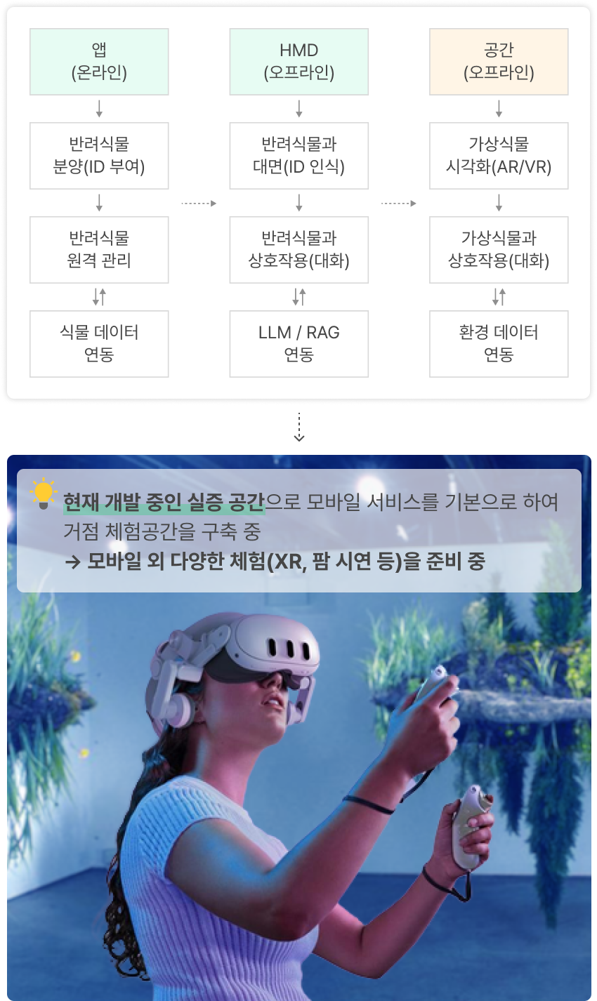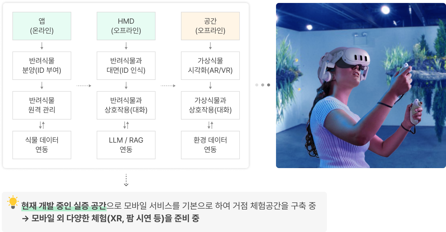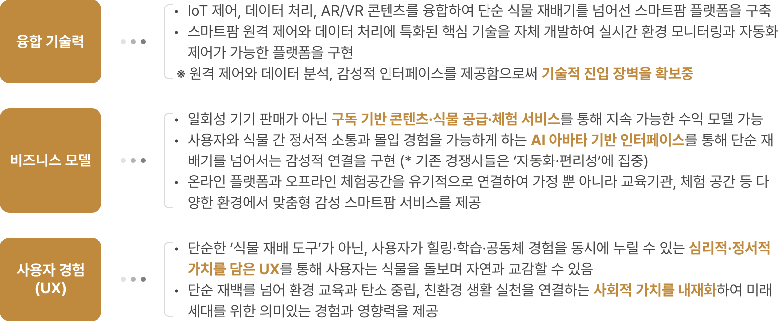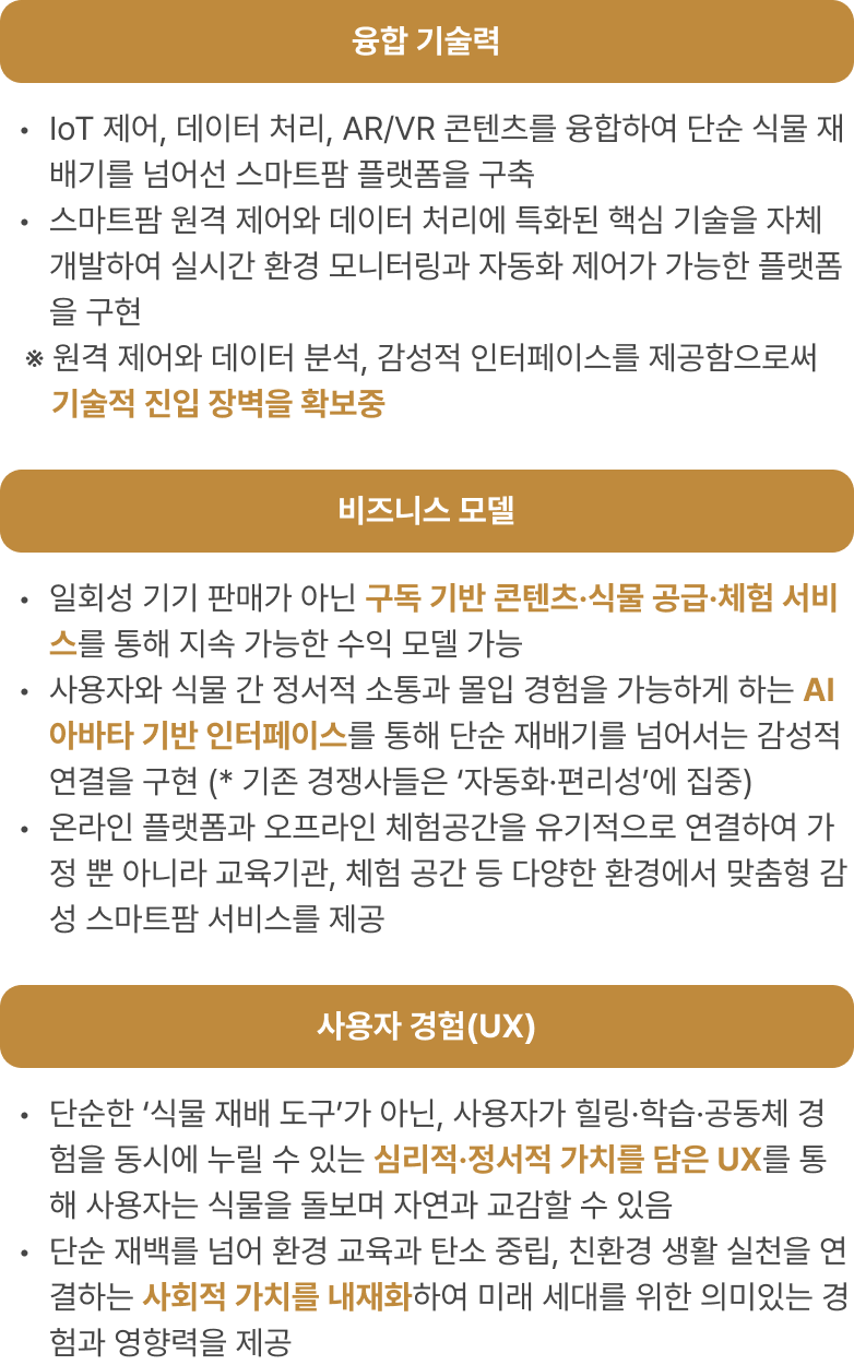 ❷ AI 기반 감성 인터페이스 및 아바타 시스템 도입으로 식물과 사용자 간 정서적 소통이 가능하며 사용자의 감정과 행동에 맞춘 맞춤형 피드백과 힐링 경험을 제공합니다. 이는 단순 재배를 넘어서는 몰입형 인터랙티브 경험으로 사용자 만족도와 지속성을 높여줍니다.