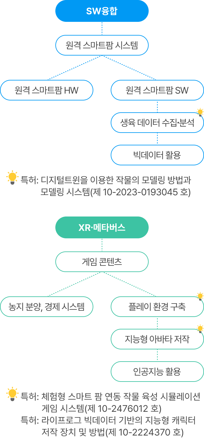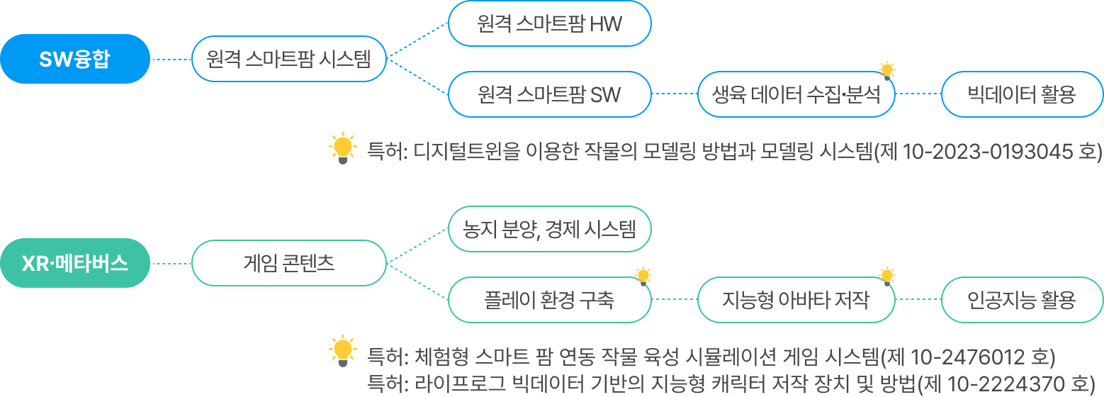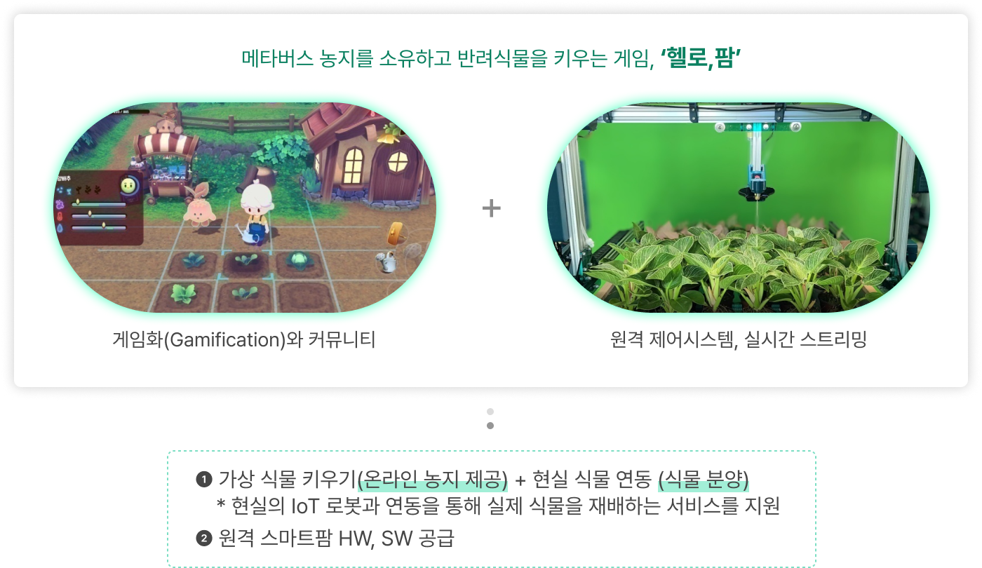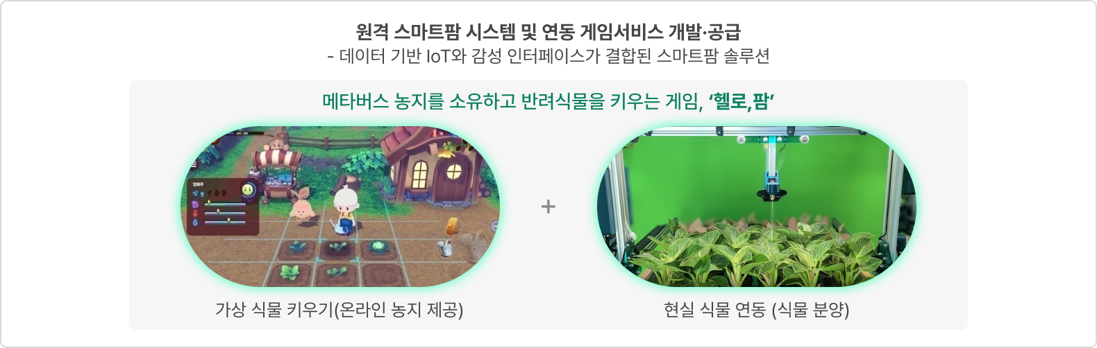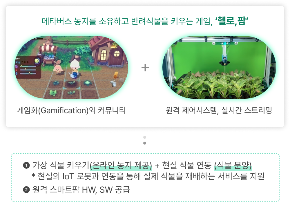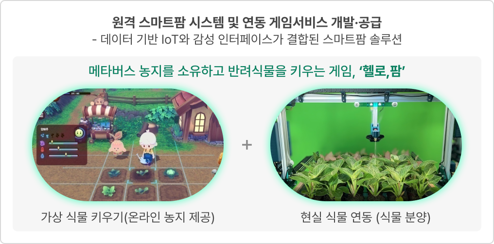 온·오프라인 융합형 메타버스 게임 ‘헬로, 팜’은 클라우드 기반 원격 제어 기술을 통해 스마트 시스템을 원격 제어함으로써 농지 접근성을 높이고, 컴퓨터 비전 및 AI 응용기술로 식물의 생장 단계와 작물 품질 상태·수준을 실시간으로 진단하고 분석합니다. 게임 구현 기술을 통해 HW-SW 연동으로 인게임에서 원격 스마트팜 및 팜셀 구동을 지원합니다. 특히 게임서비스는 2023년 11월 후원형 크라우드펀딩을 통해 타당성 검증을 마쳤습니다.