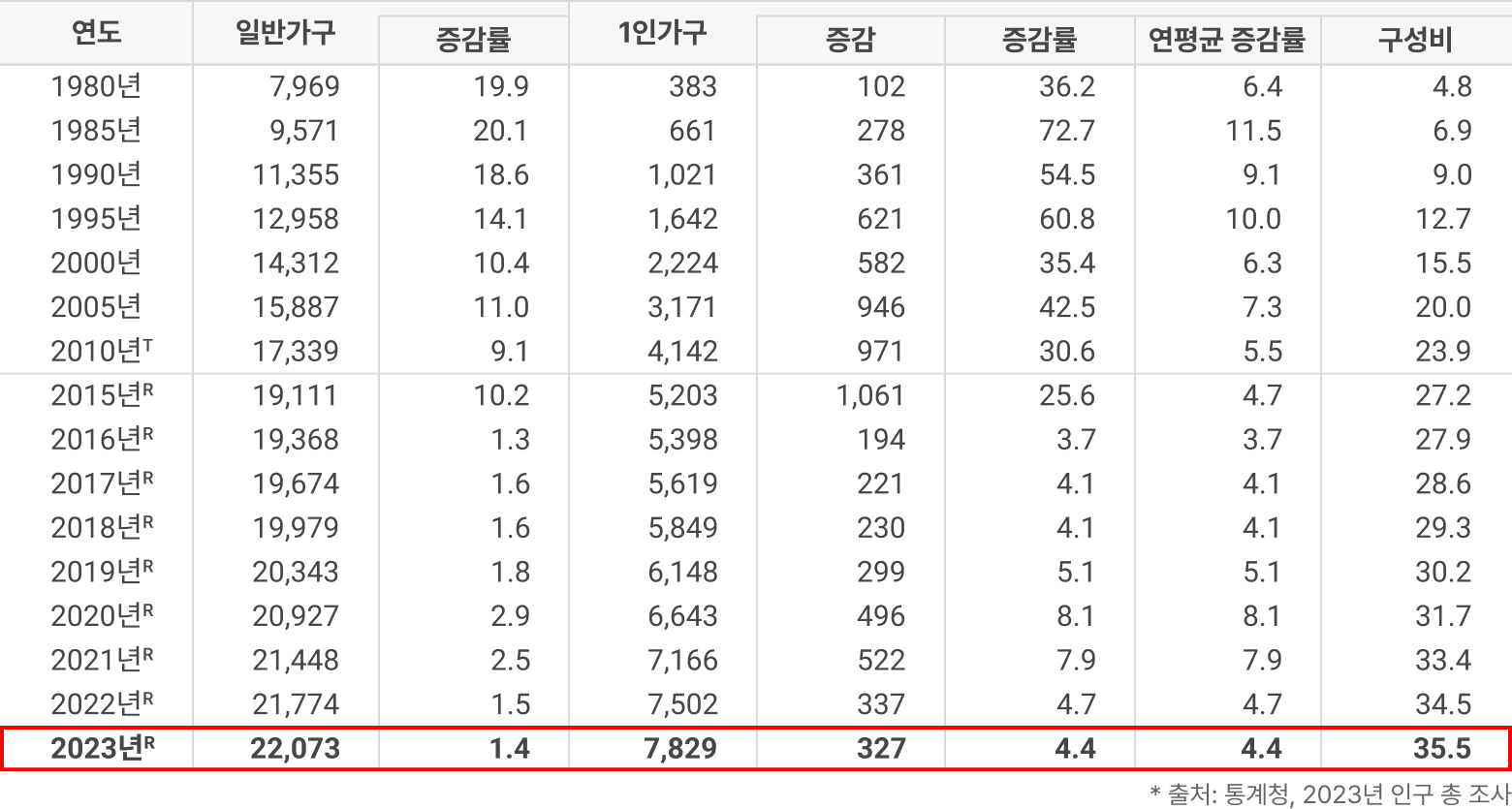 - 2023년 1인 가구 수 약 783만(가구) 중 ‘20세~39세’, 약 275만(가구)