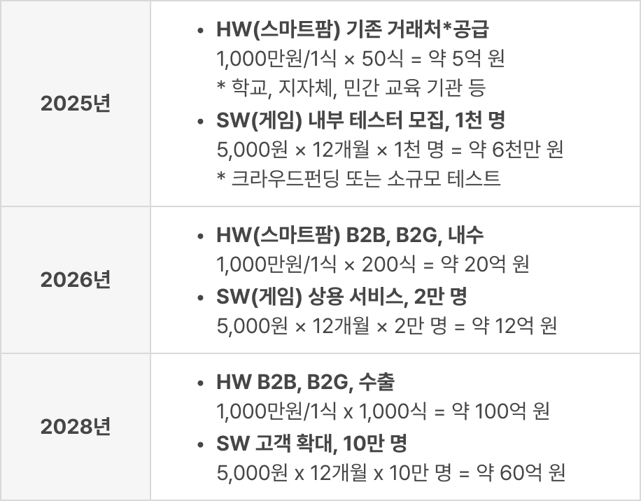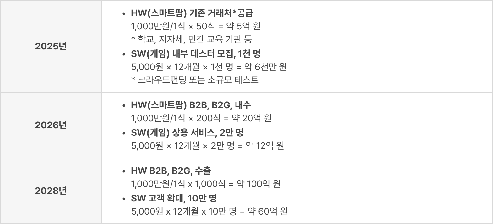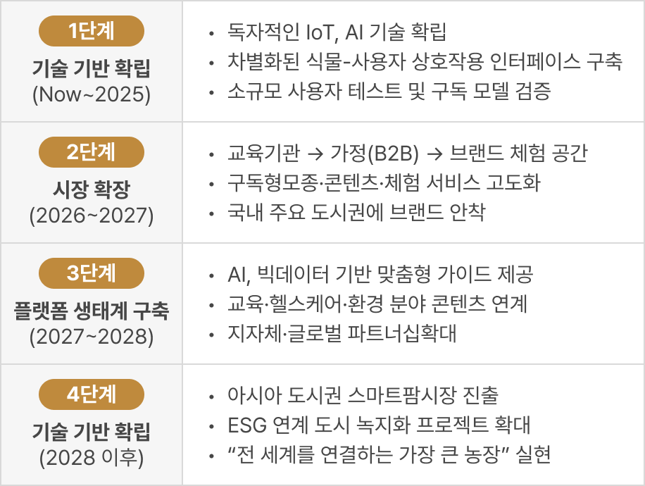 셈스게임즈는 2024년까지 사업화 ‘타당성 검증’ 단계를 마치고 2025년에는 기술 기반 확립을 목표로 독자적인 IoT/AI 기술 확립, 차별화된 식물-사용자 상호작용 인터페이스 구축, 소규모 사용자 테스트 및 구독 모델 검증을 진행하고 있습니다. 본격적인 성장을 위해 2026~2027까지 교육기관 → 가정(B2B) → 브랜드 체험 공간으로 공급 대상을 확대하고 구독형 모종·콘텐츠·체험 서비스 고도화, 국내 주요 도시권에서의 브랜드 안착을 완료할 계획이며, 2027~2028까지 플랫폼 생태계 구축을 통해 AI, 빅데이터 기반 맞춤형 가이드 제공, 교육·헬스케어·환경 분야 콘텐츠 연계, 지자체·글로벌 파트너십을 확대해갈 계획입니다.