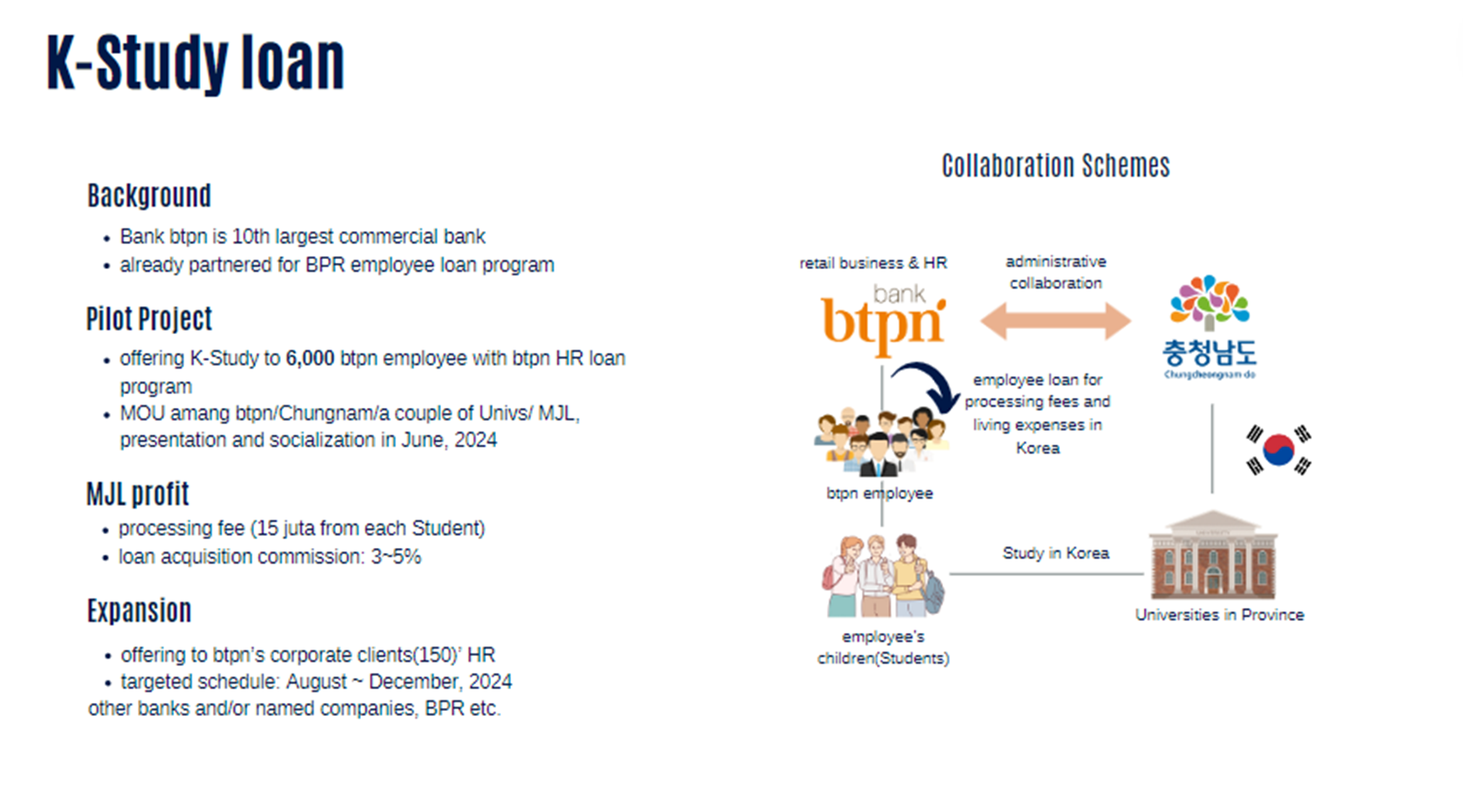 2) 한국 유학생을 충청남도 대학들과 연계(지자체 협의 중)해주고, 대출과 유학 관련 서비스를 파트너사와 함께 제공