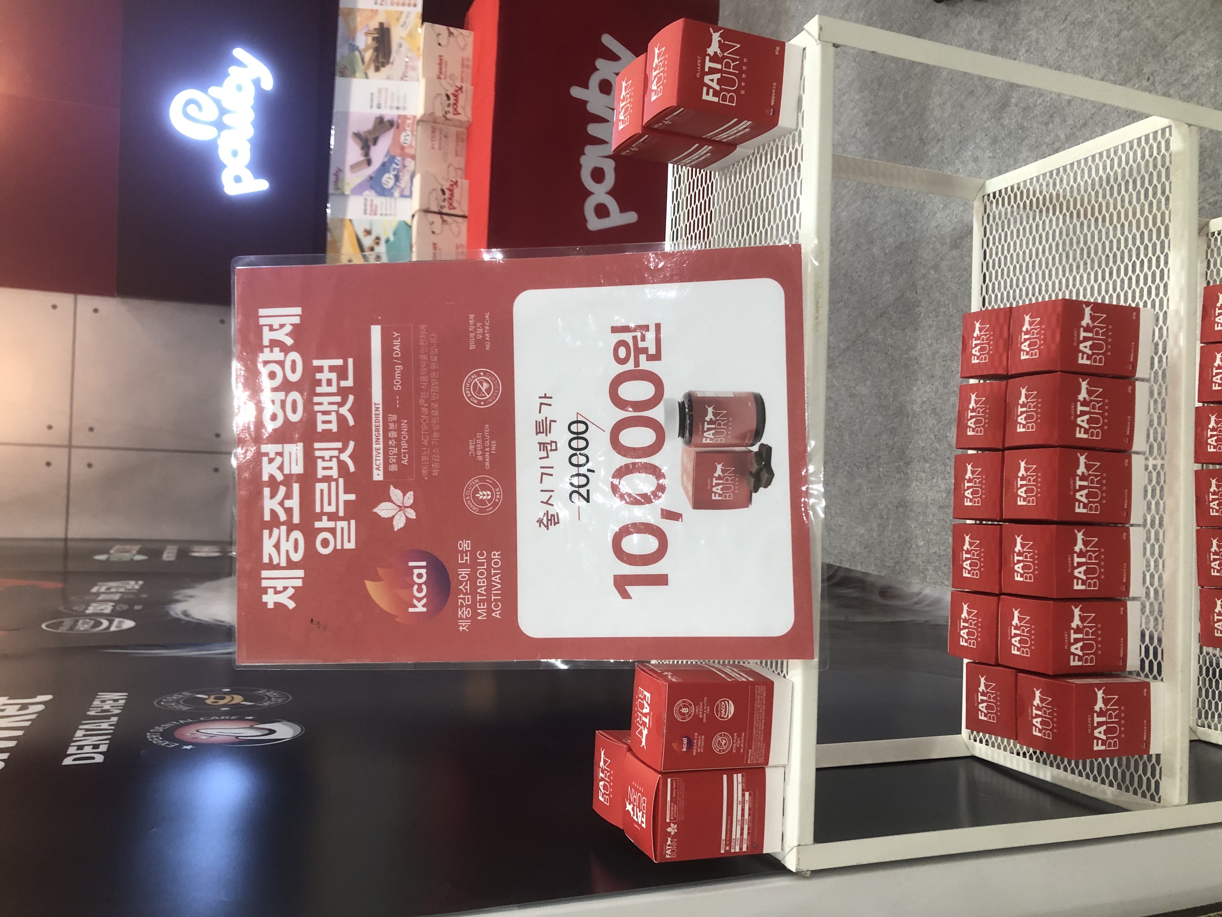 ‘체중조절 영양제 알루펫 팻번’은 제조사인 pawby의 반려견 영양 제품과 함께 전시되었으며, 체중감소 도움(Metabolic Activator) 콘셉트로 독립 진열대를 구성했습니다.