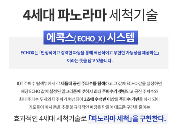 ‘에콕스(ECHO_X)’ 시스템은 안정적이고 강력한 파동과 파장을 만들어 세척이 미비한 데드존 구간을 줄여 보다 완벽한
