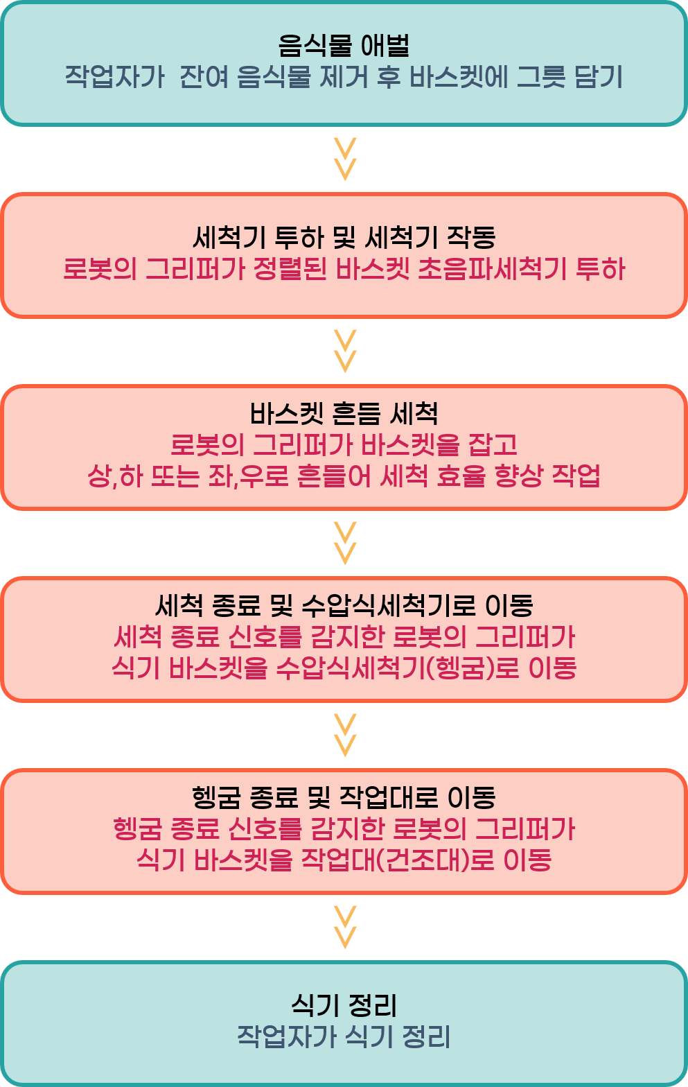 설거지 업무의 작업 순서에 따라 로봇 자동화 공정이 투입되는 작업 순서는 아래와 같습니다.