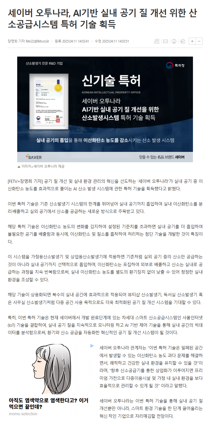 AI기반 실내 공기 질 개선 위한 산소공급시스템 특허 기술 획득