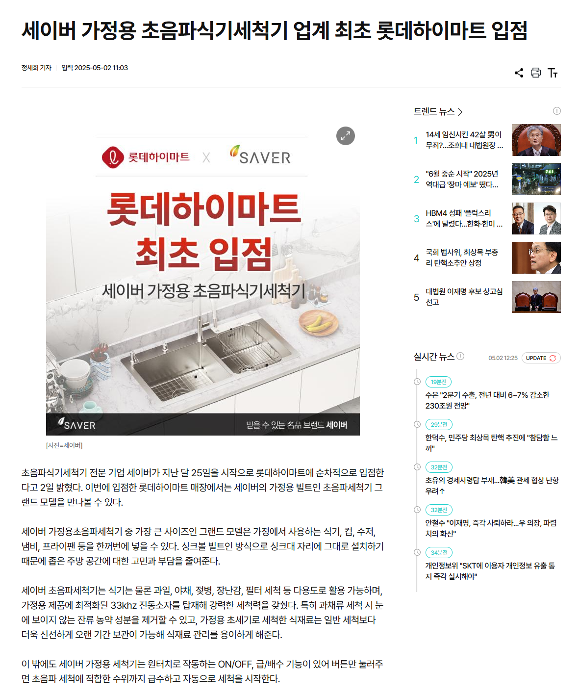세이버 가정용 초음파식기세척기 업계 최초 롯데하이마트 입점