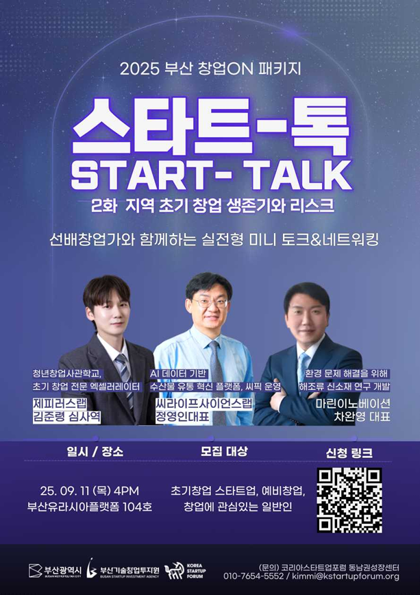 지난 9월 11일(목) 부산시와 부산기술창업투자원이 주관하는 스타트-톡(Start-Talk) 2회차 행사에 정영인 대표가 연사로 초청받아, <수산 데이터 기반 유통 혁신 모델>을 주제로 발표를 진행했습니다.
