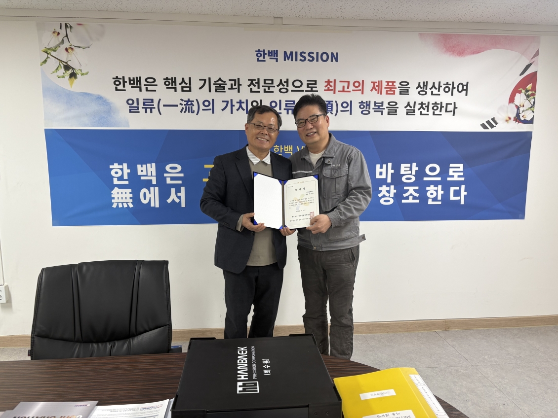 먼저 홍승환 대표이사께서 한국산업단지공단 「핵심소재 산학연협의체 운영위원」으로 위촉 되었다는 소식을 전합니다. 이는 한백정밀의 기술력과 산업 내 역할이 대외적으로 인정받은 의미 있는 성과입니다.