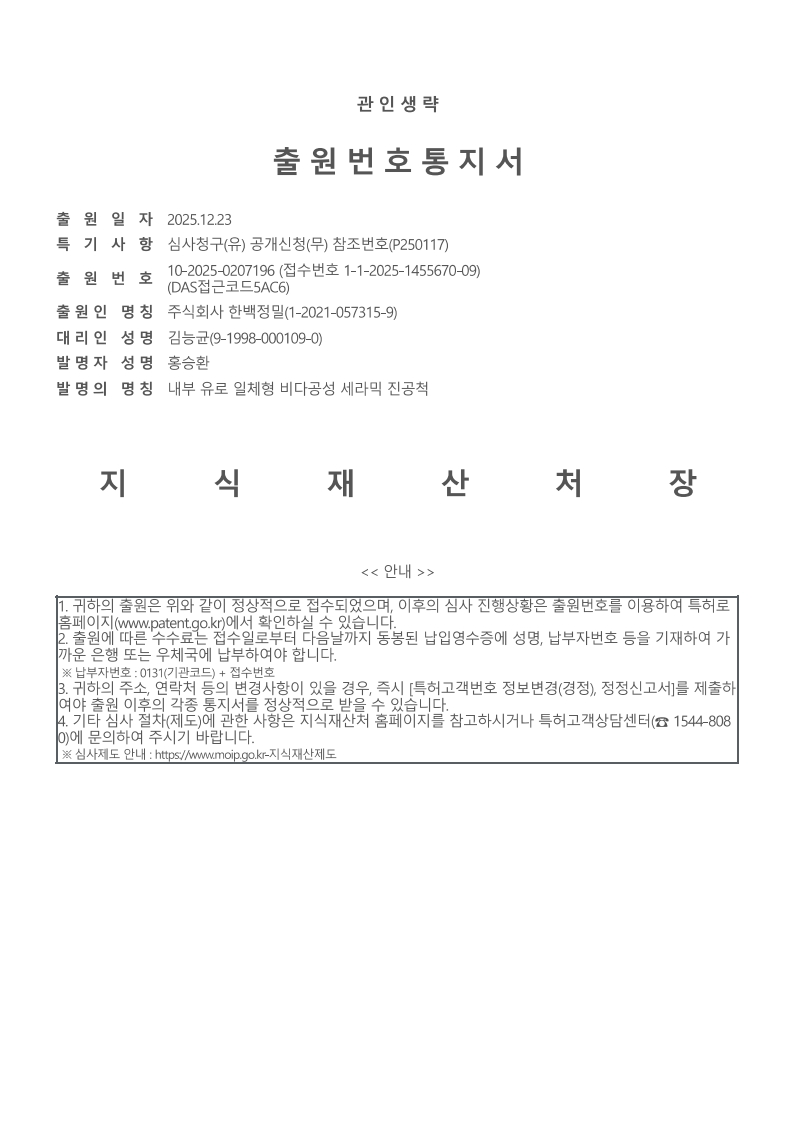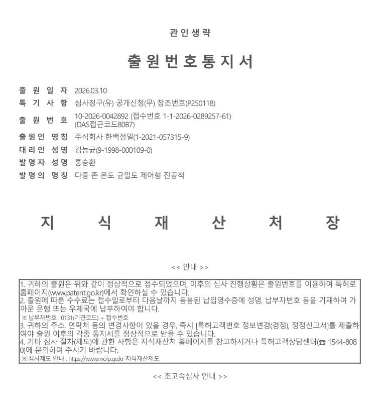 또한, 그 동안 준비해 오던 한백정밀의 핵심제품인 진공척에 관련된 2개의 특허를 출원했습니다. 해당 기술들은 향후 한백정밀의 핵심 경쟁력으로 자리매김할 것으로 기대하고 있습니다.
