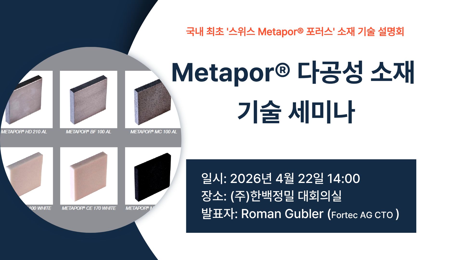 그리고, 4월 22일 스위스 메타포 포러스 소재 제조 포르텍사(Fortec)의 로만구블러(Roman Gubler)가 한백을 방문하여 다공성소재의 기술세미나를 개최할 예정입니다.