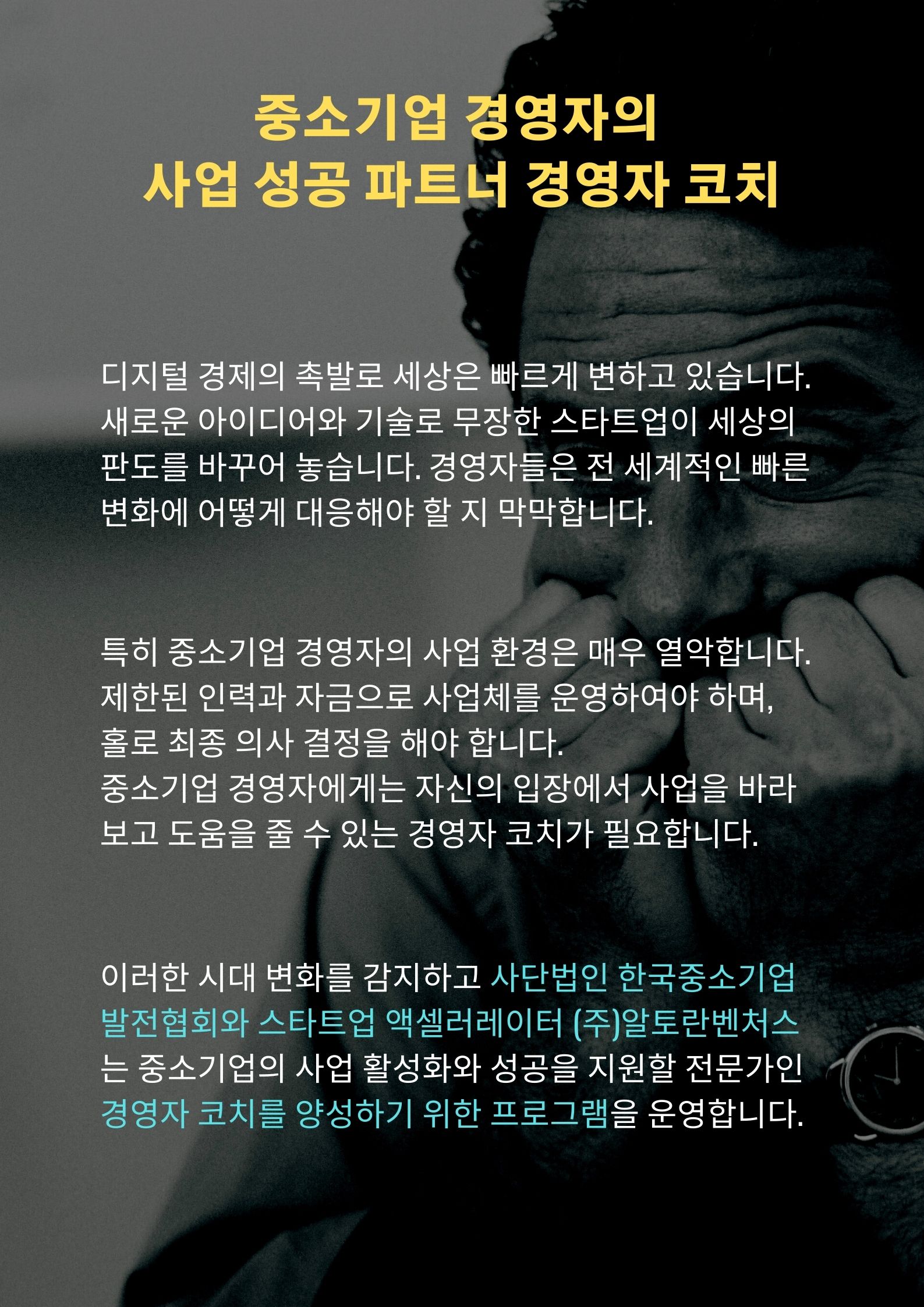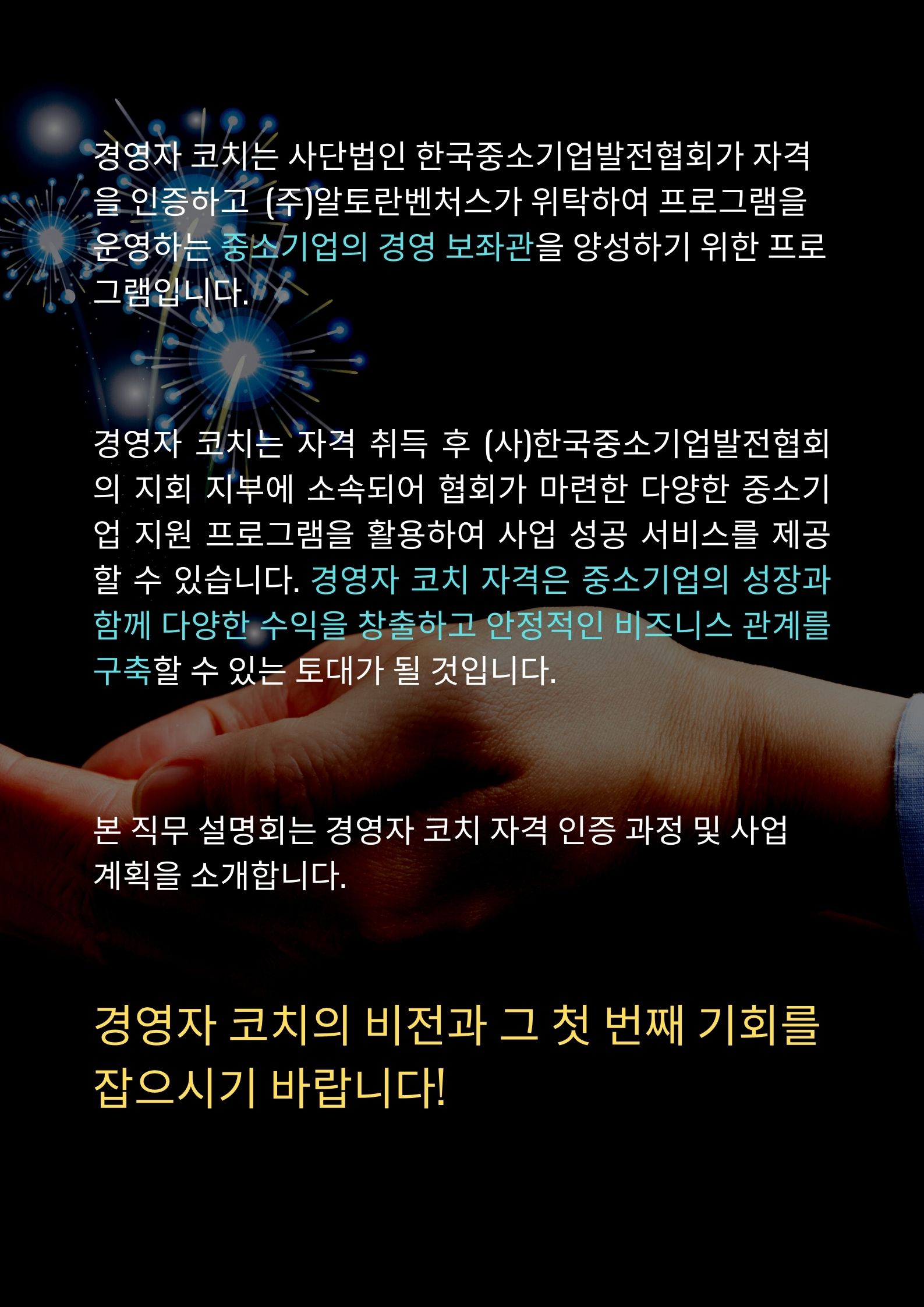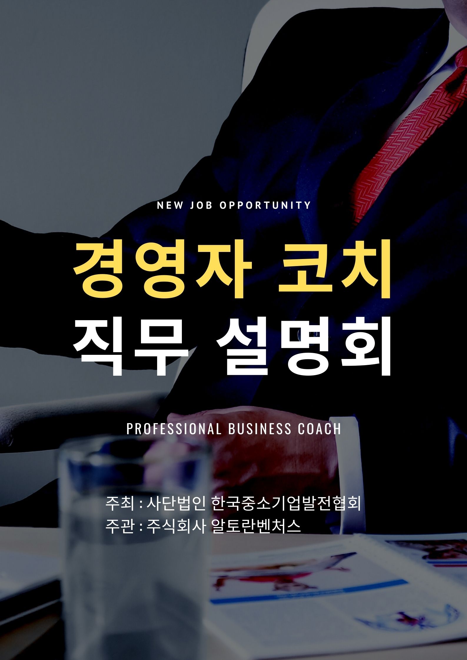 사단법인 한국중소기업발전협회가 주최하고 (주)알토란벤처스가 주관하여 진행하는 경영자 코칭 전문인력 양성 과정 설명회를 개최합니다.